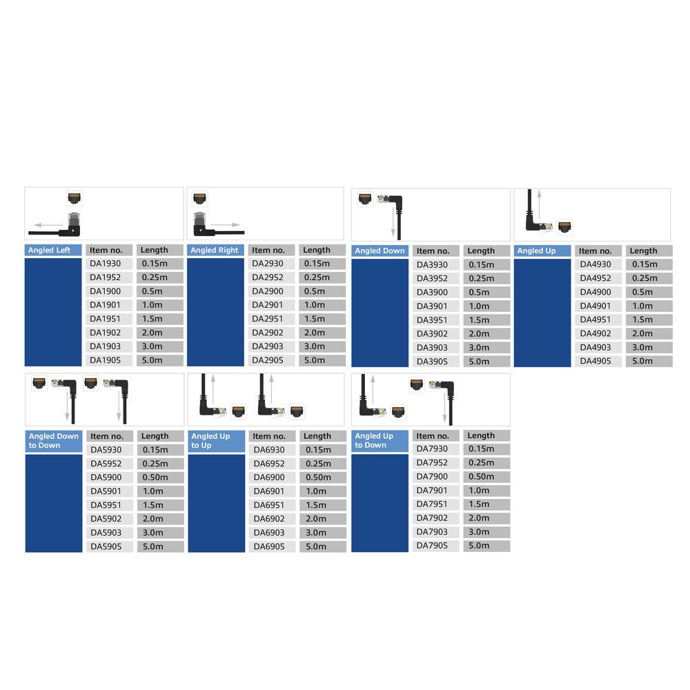 Egyenes, 90°-os lefelé, balra vagy jobbra hajló RJ45 csatlakozóval is kapható.