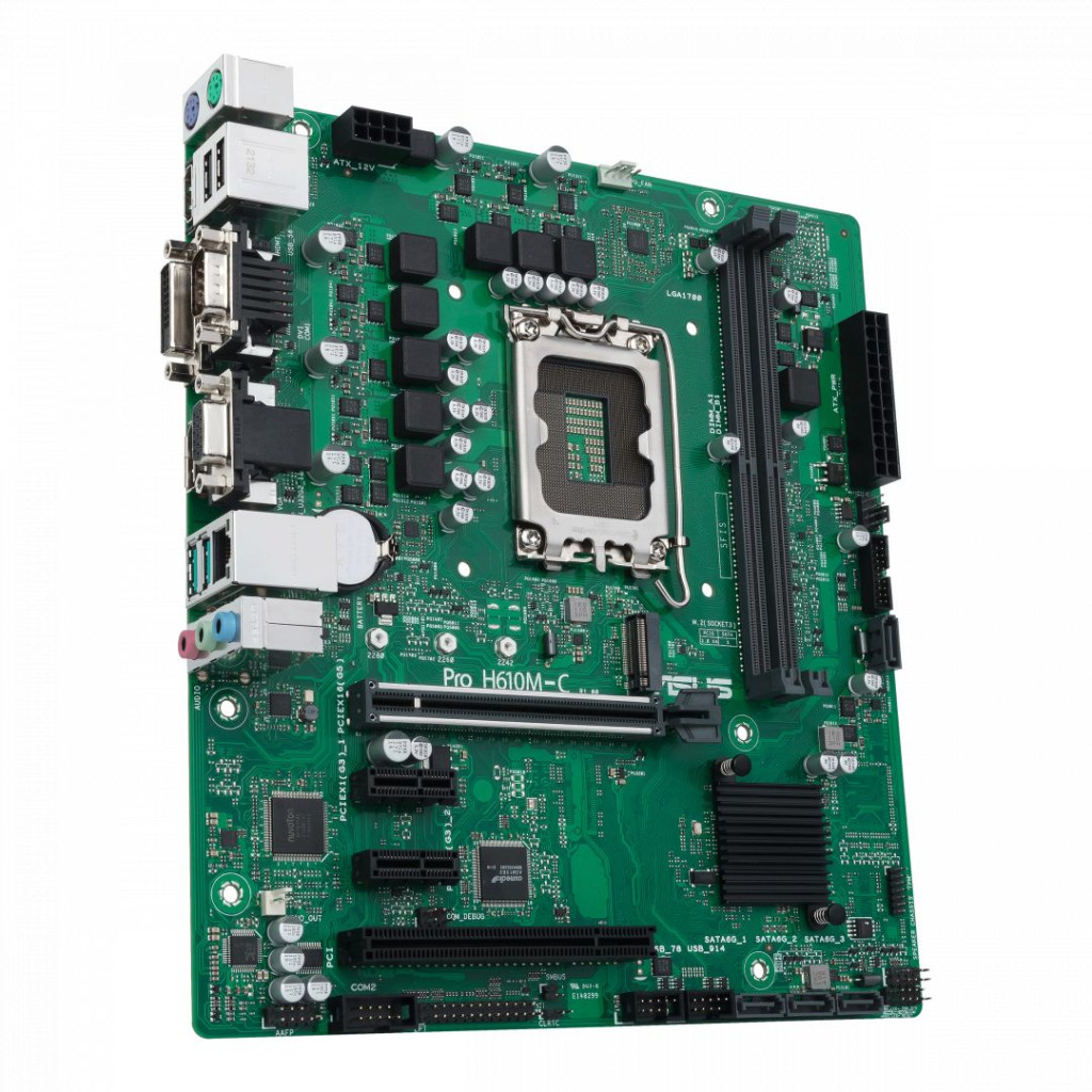 LGA1700, Intel H610, 2xDDR5, Max:4800MHz, Max:64GB, 1xPCIE16, 2xPCIE1, 1xPCI, 4xSATA3, 2xUSB, 2xUSB3.2, DVI, VGA, HDMI, DisplayPort, COM, PS2:2 db, 7.1, Gigabit, 1xM.2, Micro-ATX